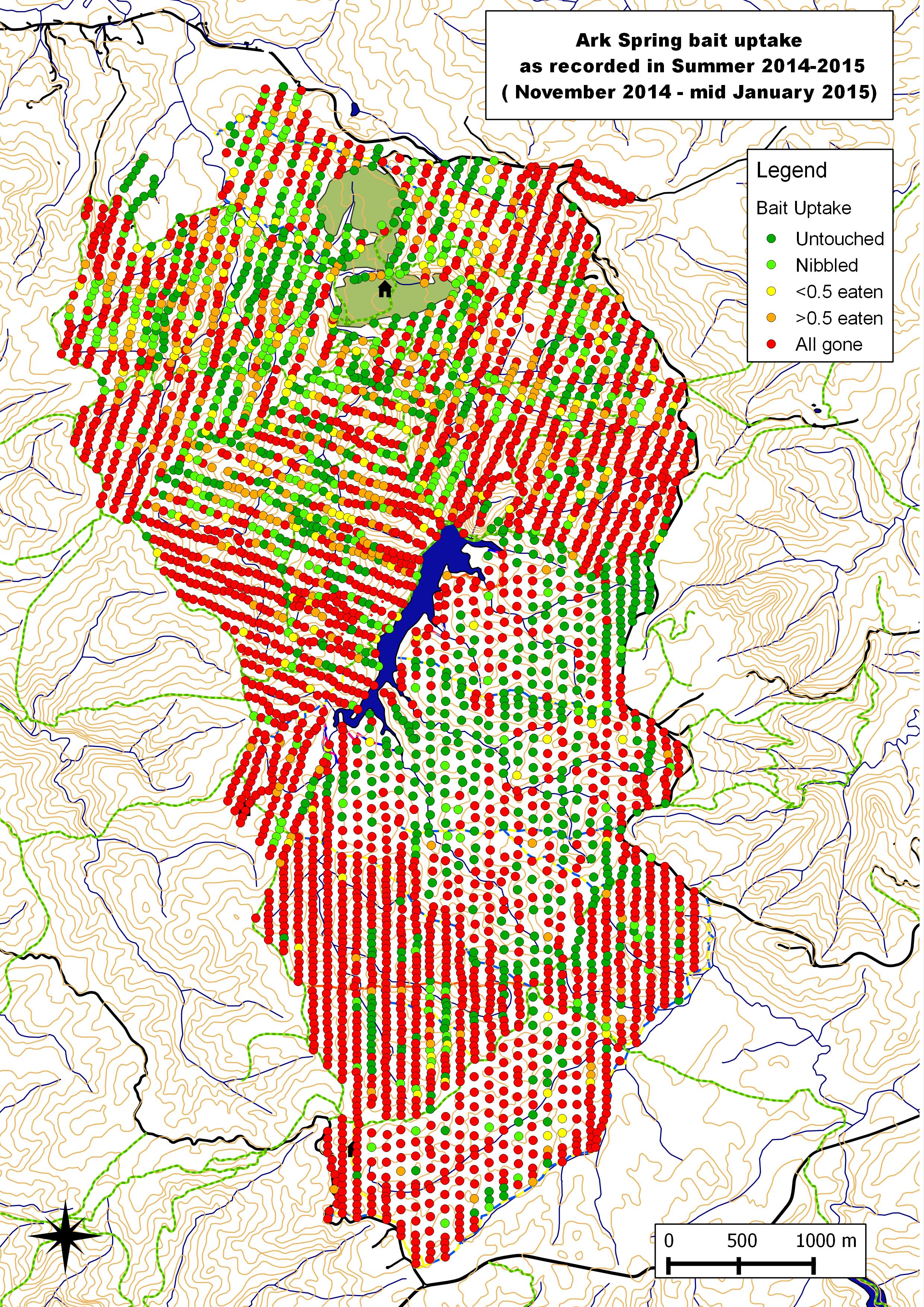 The uptake of bait placed in Spring, as recorded at the time of the second baiting cycle around two months later. The large population that survived the winter is evident, especially in the southern regions.