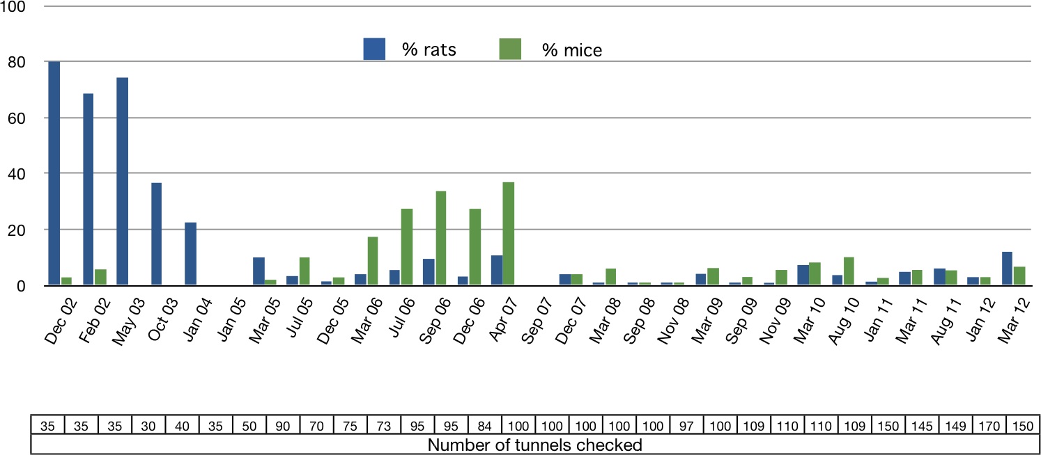 Predator control started early in 2003. The reduction in rat numbers has been spectacular - since 2007 the usual result of monitoring immediately after the Spring baiting is such that we would expect to find only one or two visited tunnels out of the 150 placed throughout the Ark. In March, around six months after the last baiting, and at the time of the natural peak for rat populations, the numbers are about 3 times higher, but still generally only 5 -8%.