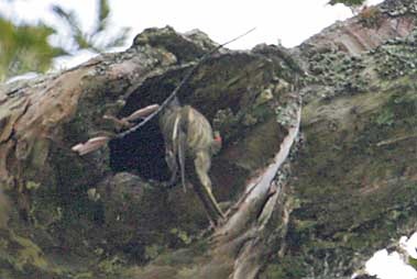 Is this bird, which is trying to drag a twig in sideways, either: (a) stupid or (b) smart? Eric Wilson points out that this technique might be to wedge the twig in to make a more secure structure.