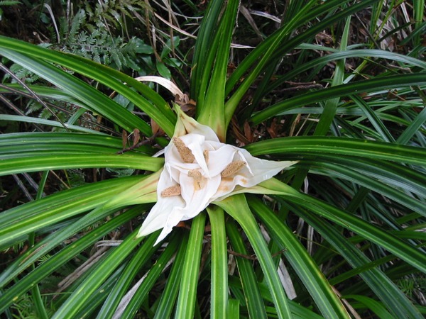 Kiekie is one of the less popular plants, to most volunteers, forming impenetrable thickets of twining stems, laced with razor-edged leaves. But the flowers are spectacular, and the white bracts are delicious (just ask the rats, who clean these out in non-controlled areas).