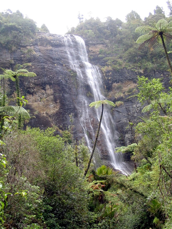 The Waitakere Ranges are an uplifted area of sea floor and under-sea volcanoes. Amongst the sedimentary rocks and clays are charactistic bands of volcanic rock, often with waterfalls like this one below the Waitakere dam.