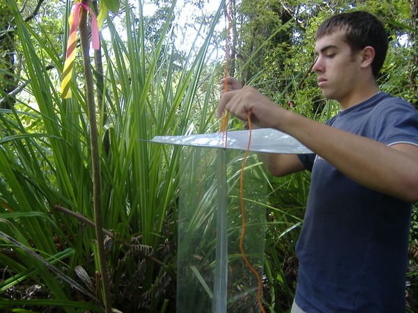 Joe Spencer, from England, helps set up wasp traps, to provide information on the population density.